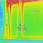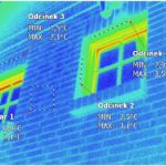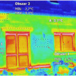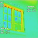 W tym wypadku mamy do czynienia z nieprawidłowo wykonaną elewacją klinkierową. Ocieplenie wykonano styropianem, a okna osadzono w ścianie nośnej budynku. Prawdopodobnie nie zastosowano pustki powietrznej, jak widać w obszarach zaznaczonych na budynku. Na nadprożach oraz na cegle koło okien widzimy duże różnice temperatur, występujące przy mostkach termicznych.
